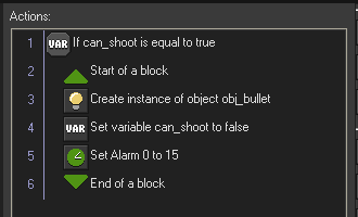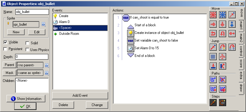 Tengo problemas para lo de disparar. Al crear el evento can_shoot siempre me da fallos. Cuando no meto ninguna variable (y por tanto, no hay espera entre bala y bala) no tengo problema