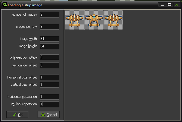 Añadimos un sprite nuevo, desde el menú Resources – Create New Sprite. Lo llamaremos spr_myplane. En vez de dar le al botón Load sprite, para cargar una imagen o varias para hacer la animación, le damos al botón Edit sprite. En la ventana de edición, le damos al menú File – Create from Strip y buscamos la imagen myplane_strip3.png. Se abrirá la siguiente ventana: