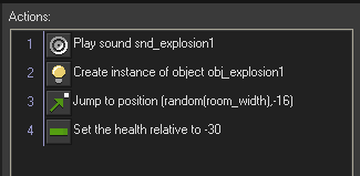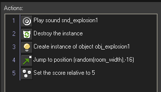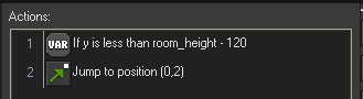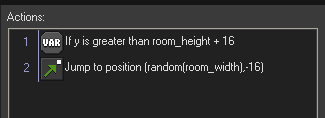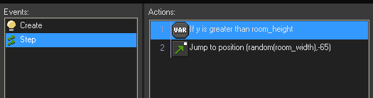 Ahora usaremos una función de sistema (las variables almacenan valores y las funciones ejecutan acciones). Añadimos al mismo evento una acción Jump Position con valor x random(room_width) y valor y -65. El evento Step