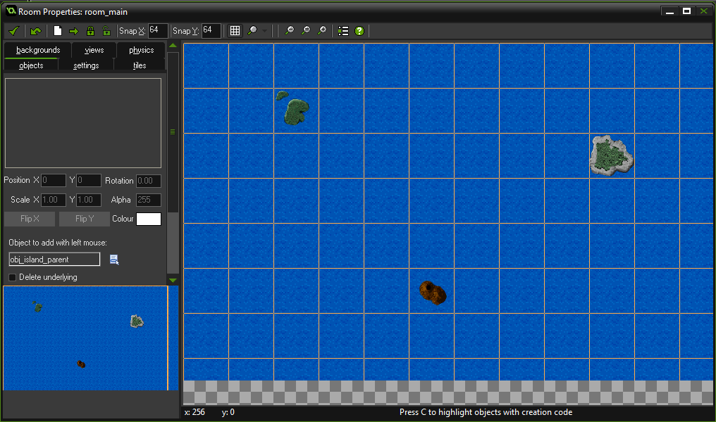 Cuando tengamos los tres objetos de islas, los añadimos en la room. En la pestaña Objects de la room anterior, elegimos cada uno y hacemos click en la room que vemos (en cualquier lugar). Quedará más o menos así: