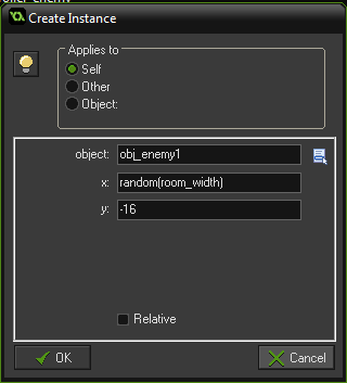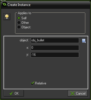 i elegimos obj_explosion1. En x/y ponemos 0 y marcamos la casilla Relative.
