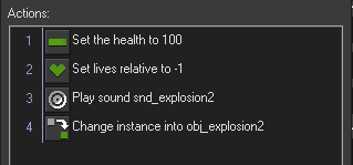 Hacemos un objeto obj_explosion1, con su sprite asociado spr_explosion1. Añadimos el evento Animation End, y una acción de Destroy Instance