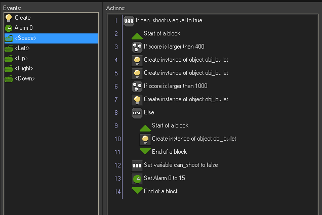 Ahora añadimos una acción nueva a este objeto. Haremos que cuando hayamos superado los 400 puntos, obj_myplane pueda disparar dos balas, dónde sale una en cada ala. También pondremos que si supera los 1000 puntos, también dispare una tercera. Las acciones quedan de la siguiente manera: